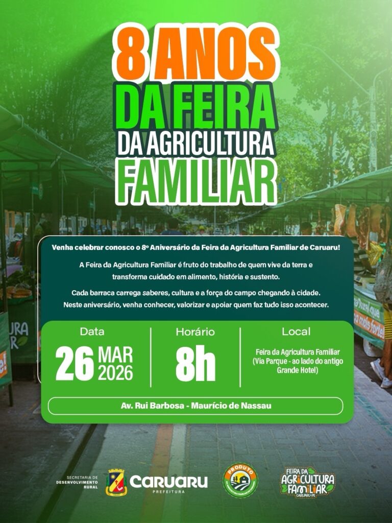A Feira da Agricultura Familiar de Caruaru celebra oito anos nesta quinta-feira (26). Para comemorar a data, uma programação especial será realizada a partir das 8h, na Feira da Via Parque. Terá entrega de sementes para agricultores, atividades educativas alusivas ao Dia Mundial da Água, entre outras. A feira funcionará no horário normal, das 5h