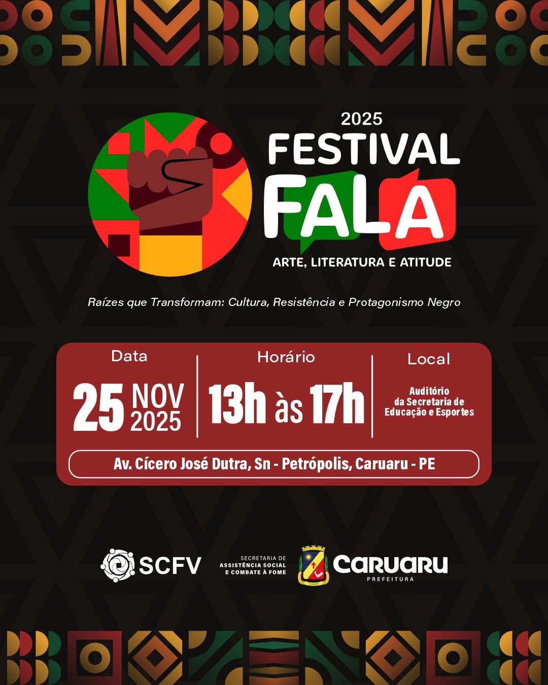 A Prefeitura de Caruaru, por meio da Secretaria de Assistência Social e Combate à Fome, realiza amanhã (25), o Festival de Arte, Literatura e Atitude – FALA 2025, promovido pela Coordenação Municipal do Serviço de Convivência e Fortalecimento de Vínculos (SCFV). O evento acontecerá das 13h às 17h, no Auditório da Secretaria de Educação e Esportes, e será aberto ao público.