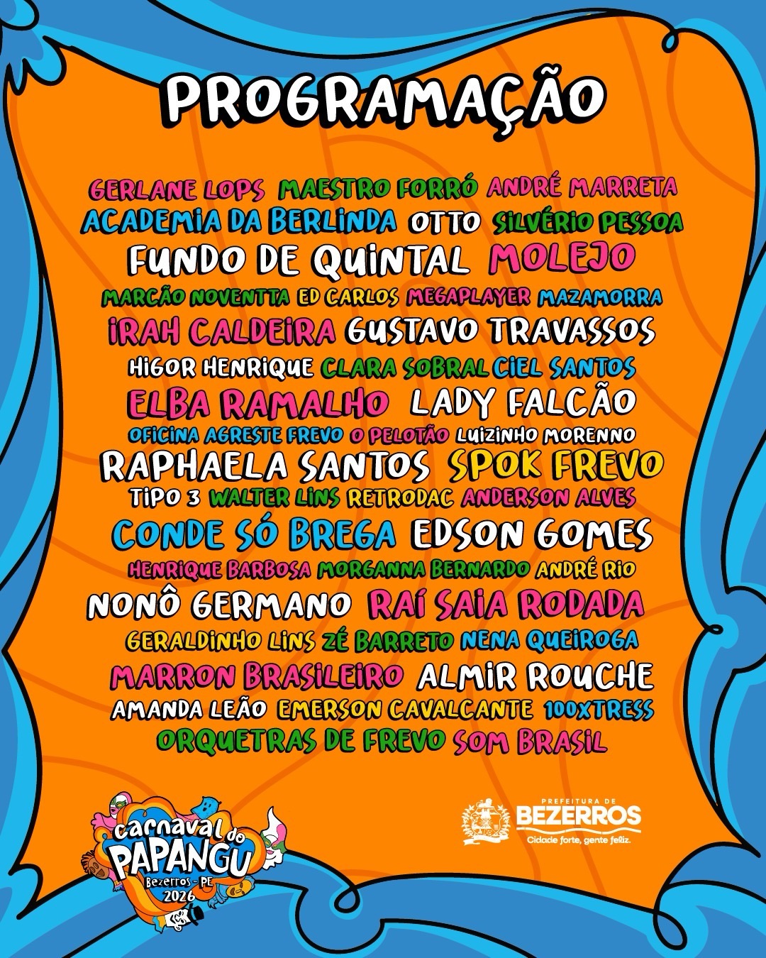 Outros nomes como Morganna Bernardo, Lady Falcão, Almir Rouche, Henrique Barbosa, Marcão Noventta, Ciel Santos, Zé Barreto, Ed Carlos, Higor Henrique, Mega Play, Retrodac, Walter Lins, Amannda Leão, Anderson Alves, Som Brasil, Pagode Tipo 3, 100Xtress, Irah Caldeira, Emerson Cavalcante, O Pelotão, Mazamorra, Luizinho Moreno, Oficina Agreste Frevo, além de Orquestras de Frevo são presenças confirmadas na folia 2026.