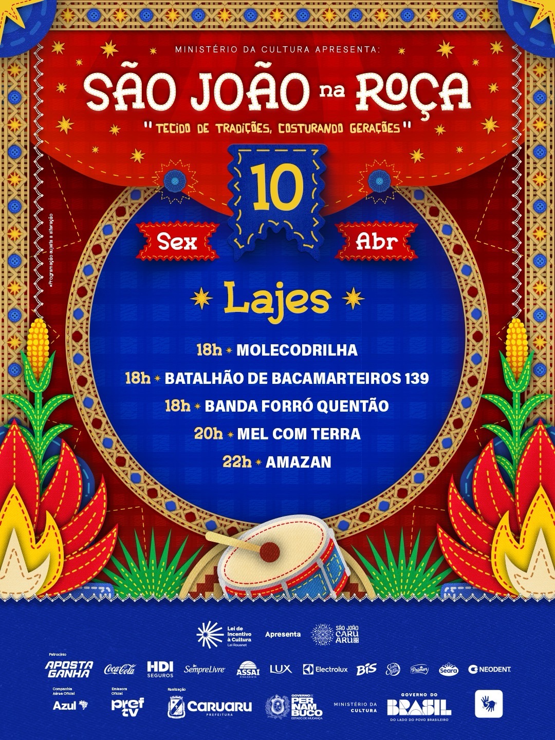 A primeira parada, nesta sexta-feira (10), será a Vila de Lajes, com uma programação que começa a partir das 18h. Se apresentam Molecodrilha, o Batalhão de Bacamarteiros 139 e a banda Forró Quentão. Às 20h, o público confere o show de Mel com Terra e, encerrando a noite, às 22h, o cantor Amazan chega com muito forró.
